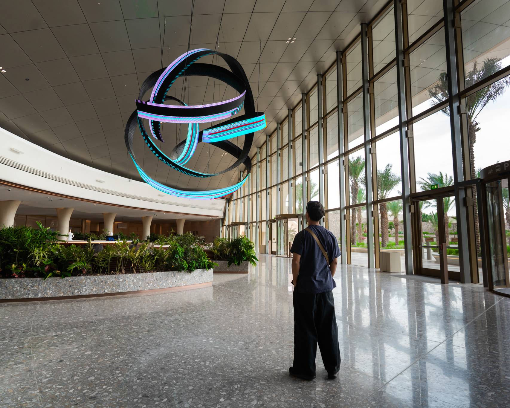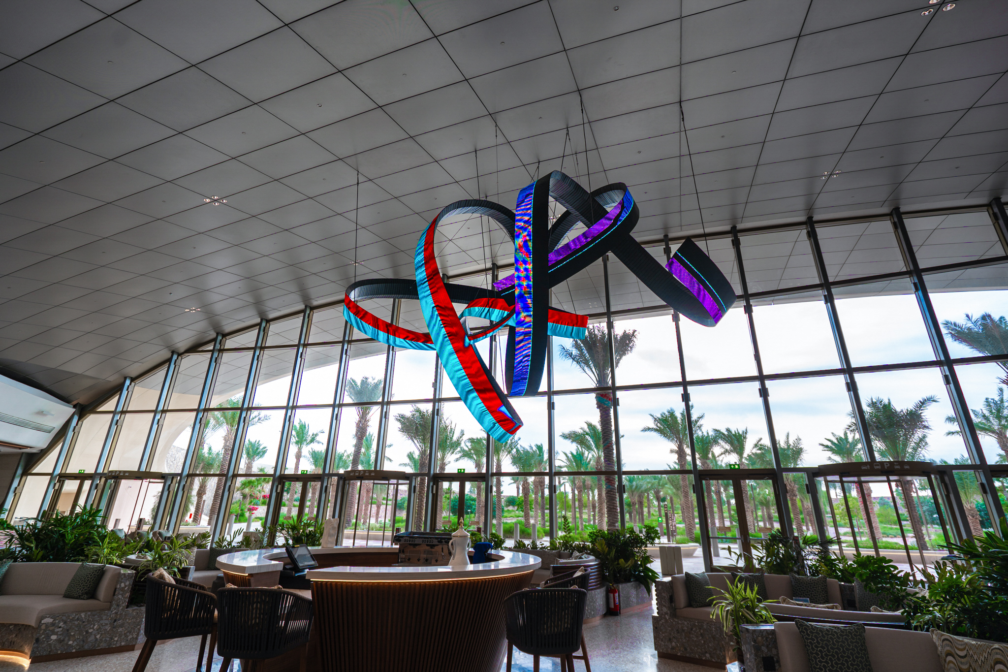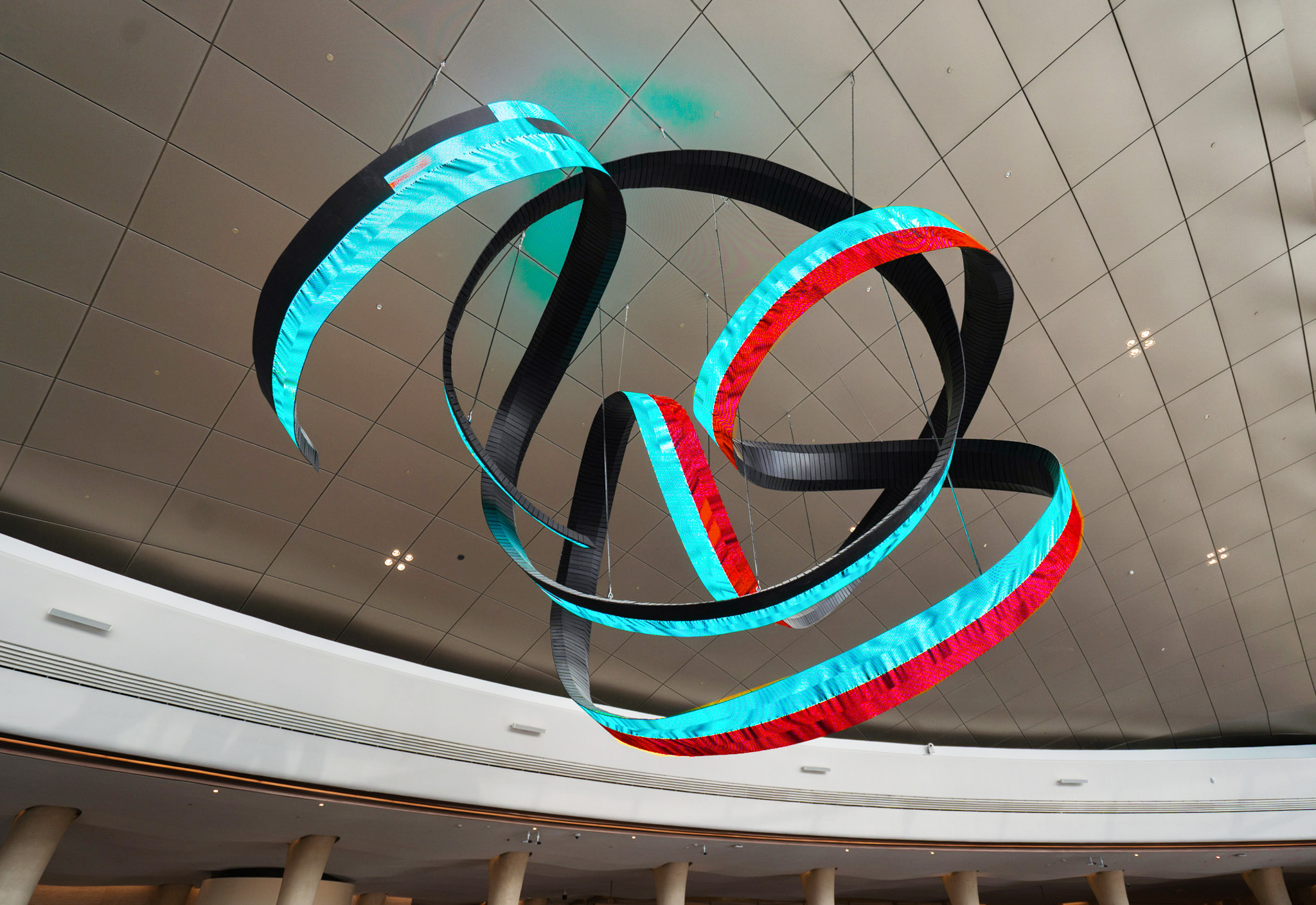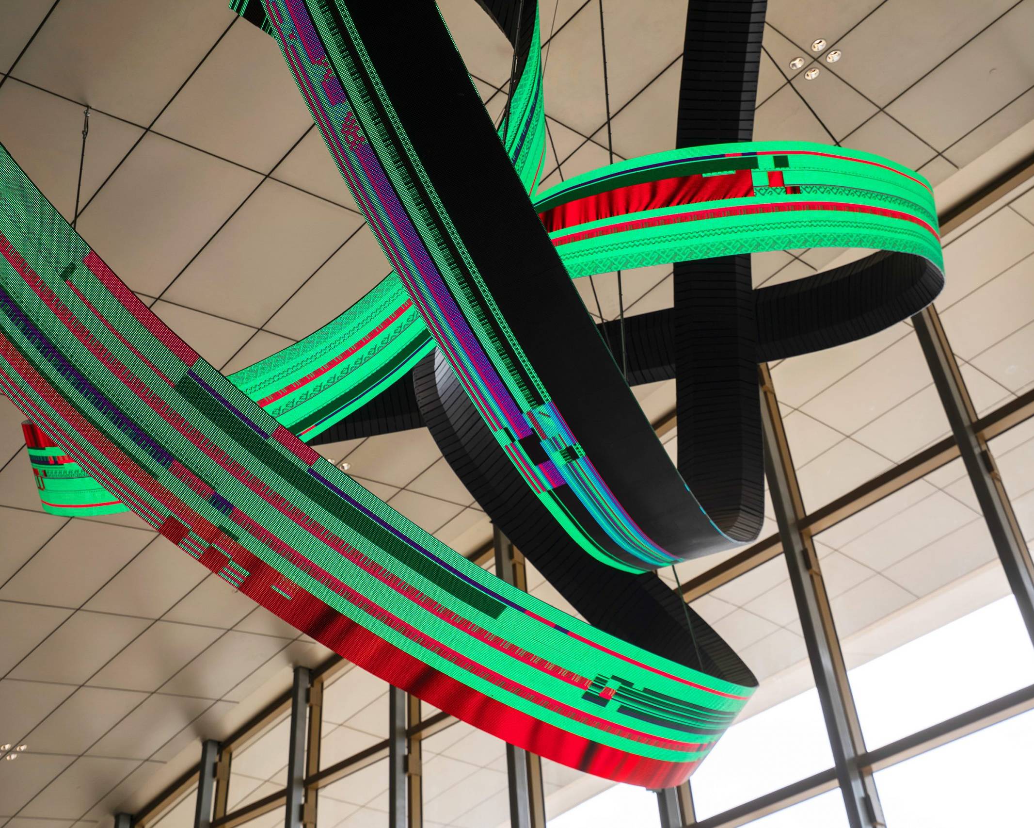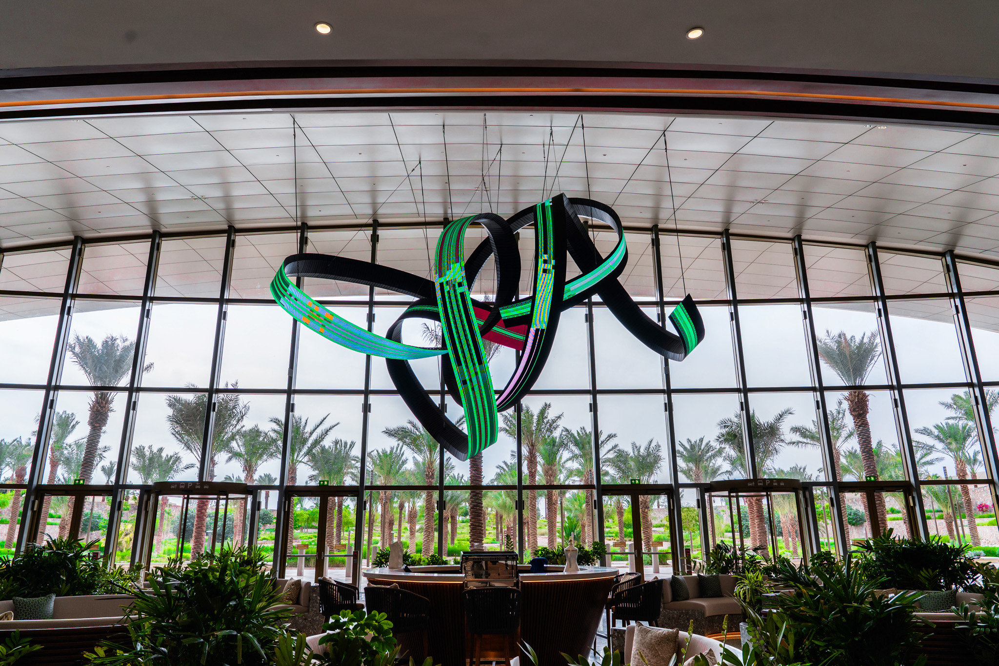 Alfa Arte Foundry colaboró con el artista contemporáneo Daniel Canogar para dar vida a Shuttle, una escultura en espiral de 6 x 9 metros y 1.000 kg, suspendida en el Centro de Bienvenida del Aeropuerto Internacional del Mar Rojo. La pieza integra pantallas LED en forma de cinta que muestran visuales generativos inspirados en el tejido Sadu y alimentados por datos medioambientales en tiempo real, como el viento y las corrientes oceánicas.