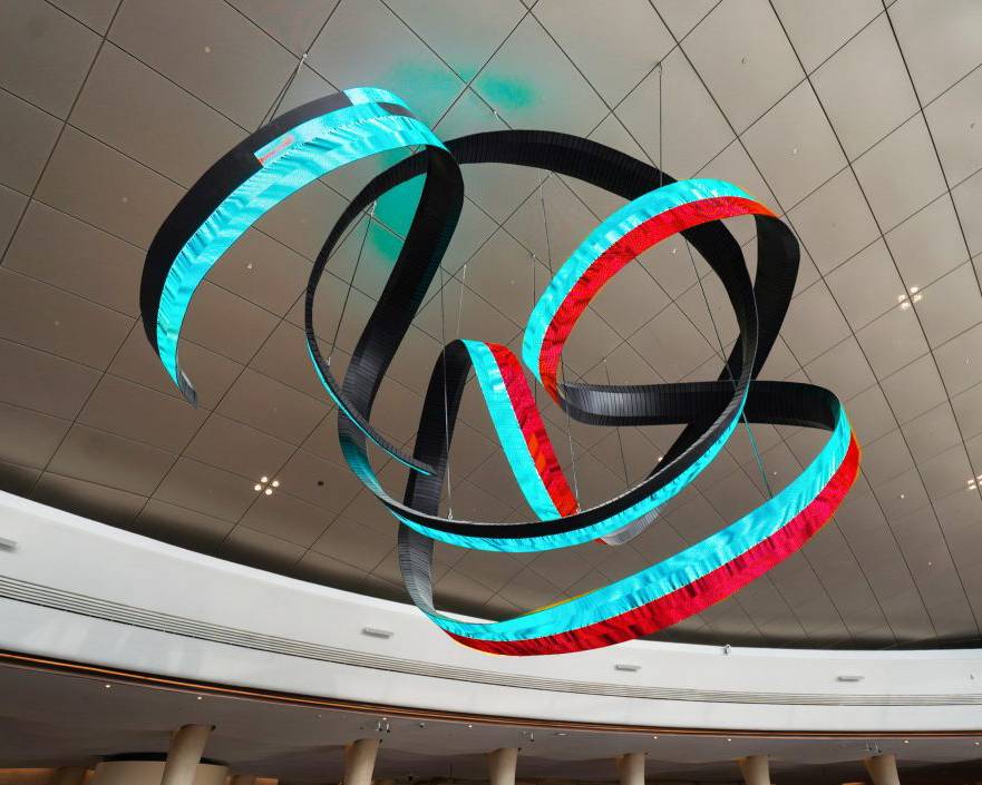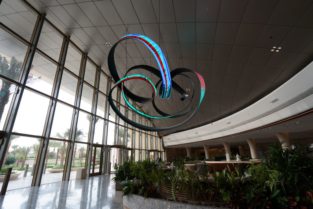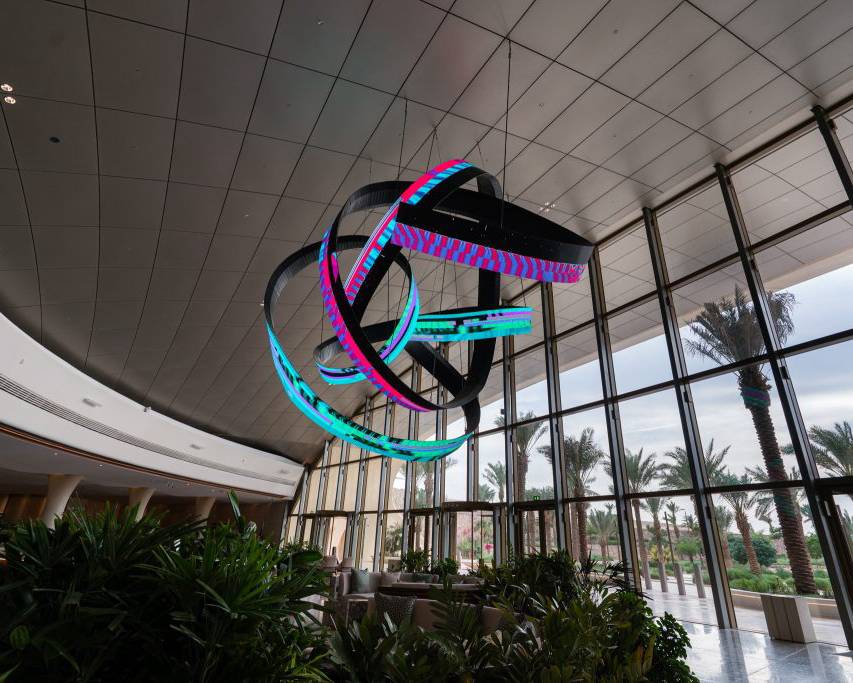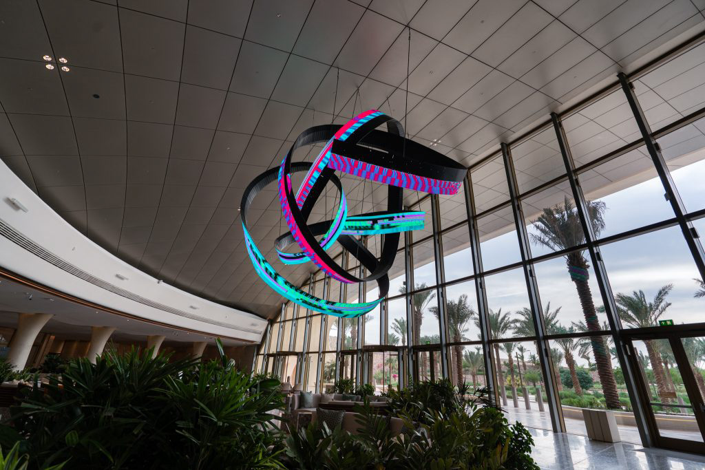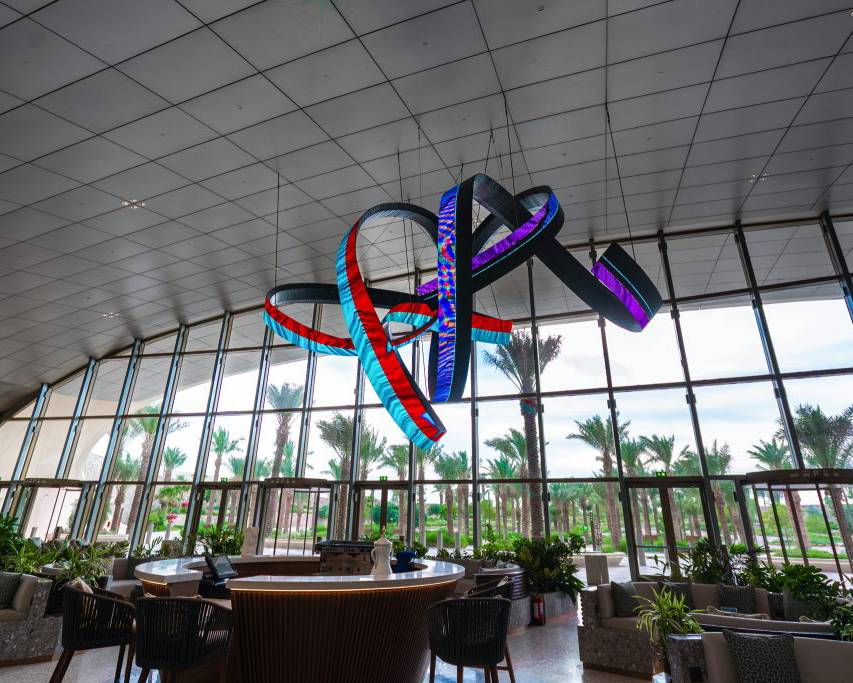 Alfa Arte Foundry collaborated with contemporary artist Daniel Canogar to bring Shuttle to life—a 6 x 9 metre, 1,000 kg spiralling sculpture suspended in the Welcome Centre of Red Sea International Airport. The piece features ribbon-like LED screens displaying generative visuals inspired by Sadu weaving, driven by real-time environmental data such as wind and ocean currents.