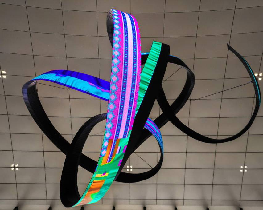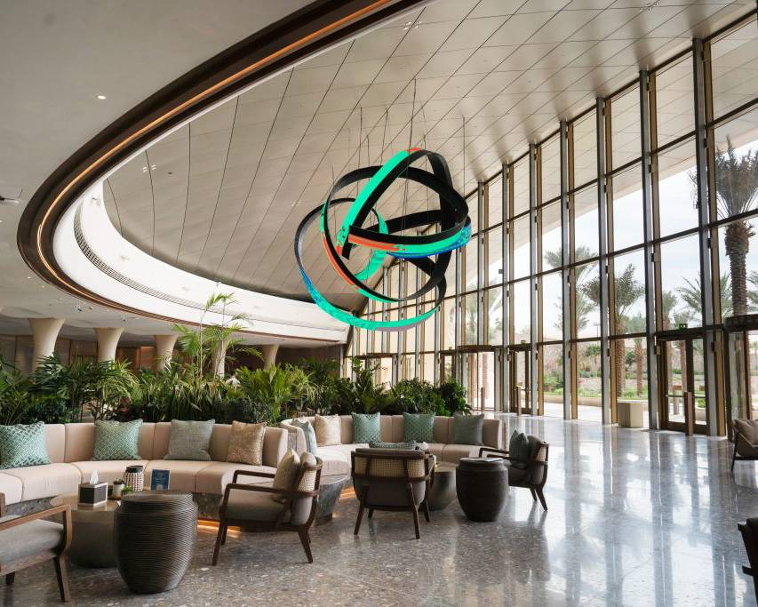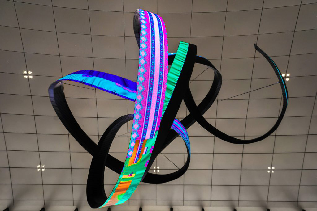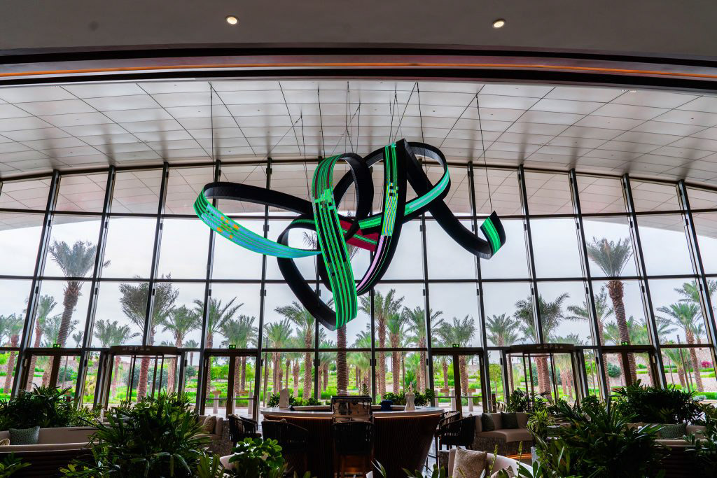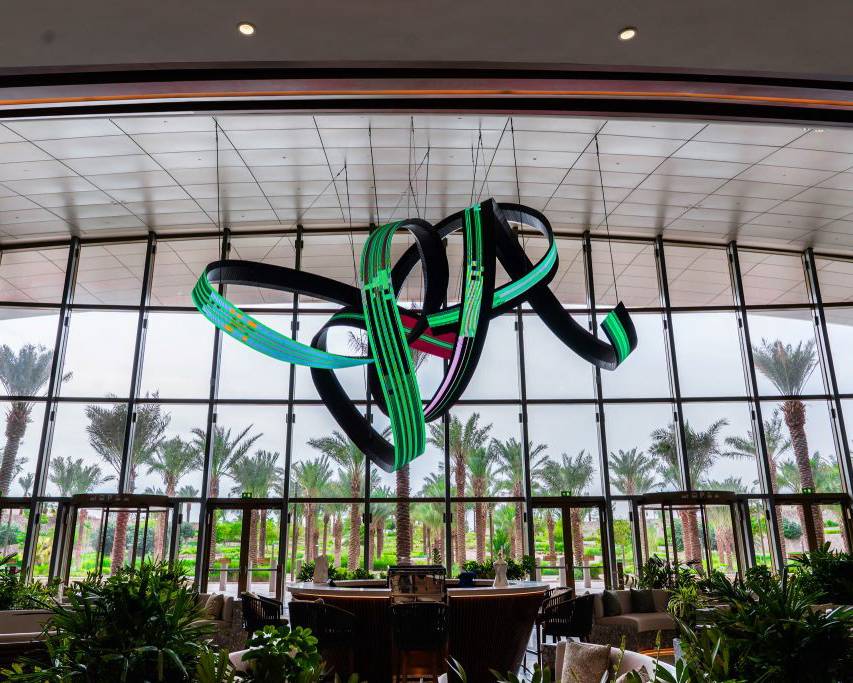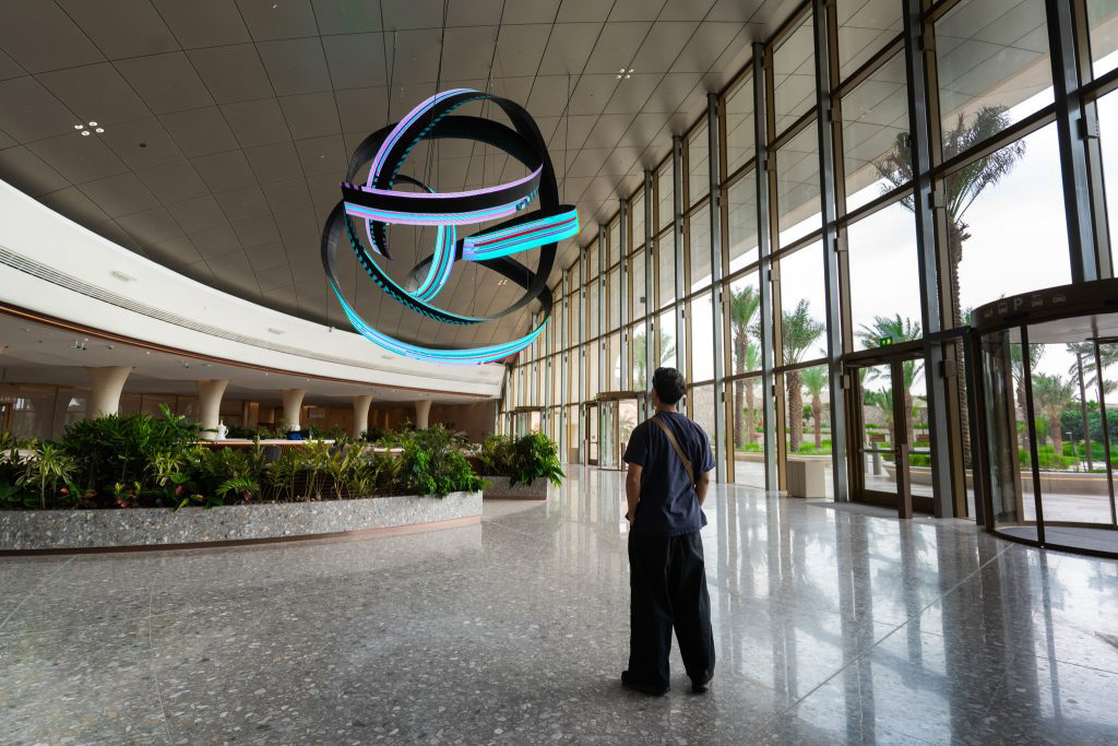 Alfa Arte Foundry collaborated with contemporary artist Daniel Canogar to bring Shuttle to life—a 6 x 9 metre, 1,000 kg spiralling sculpture suspended in the Welcome Centre of Red Sea International Airport. The piece features ribbon-like LED screens displaying generative visuals inspired by Sadu weaving, driven by real-time environmental data such as wind and ocean currents.