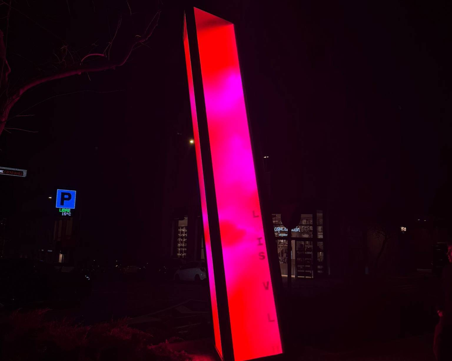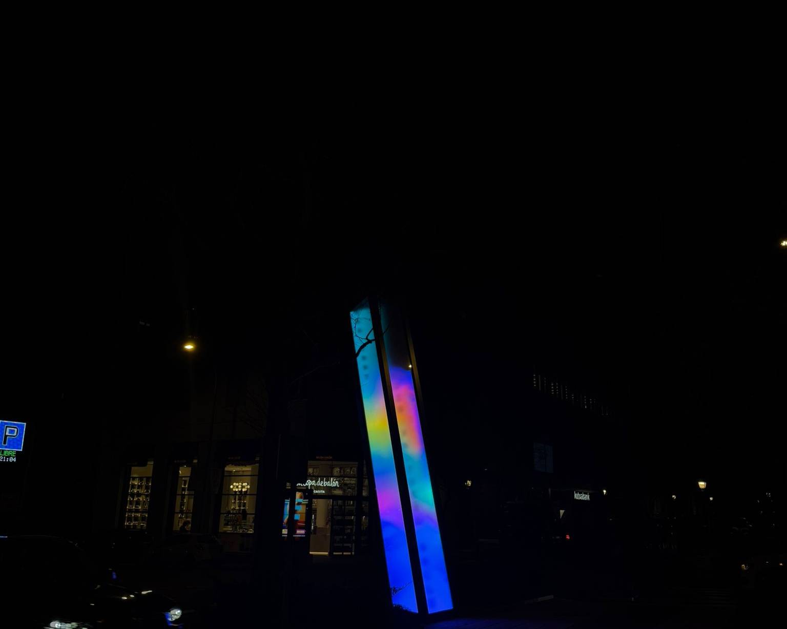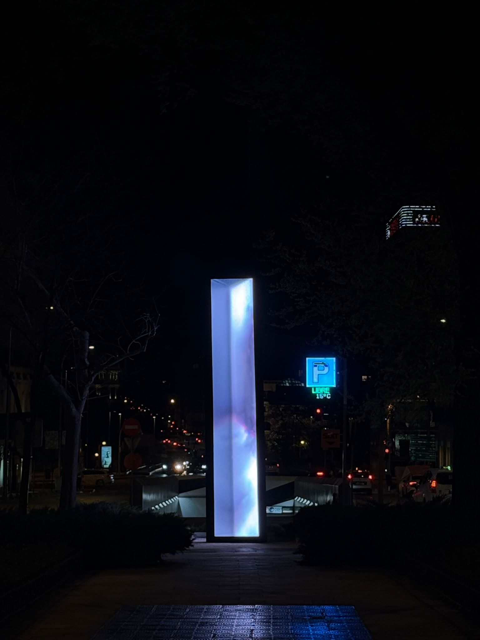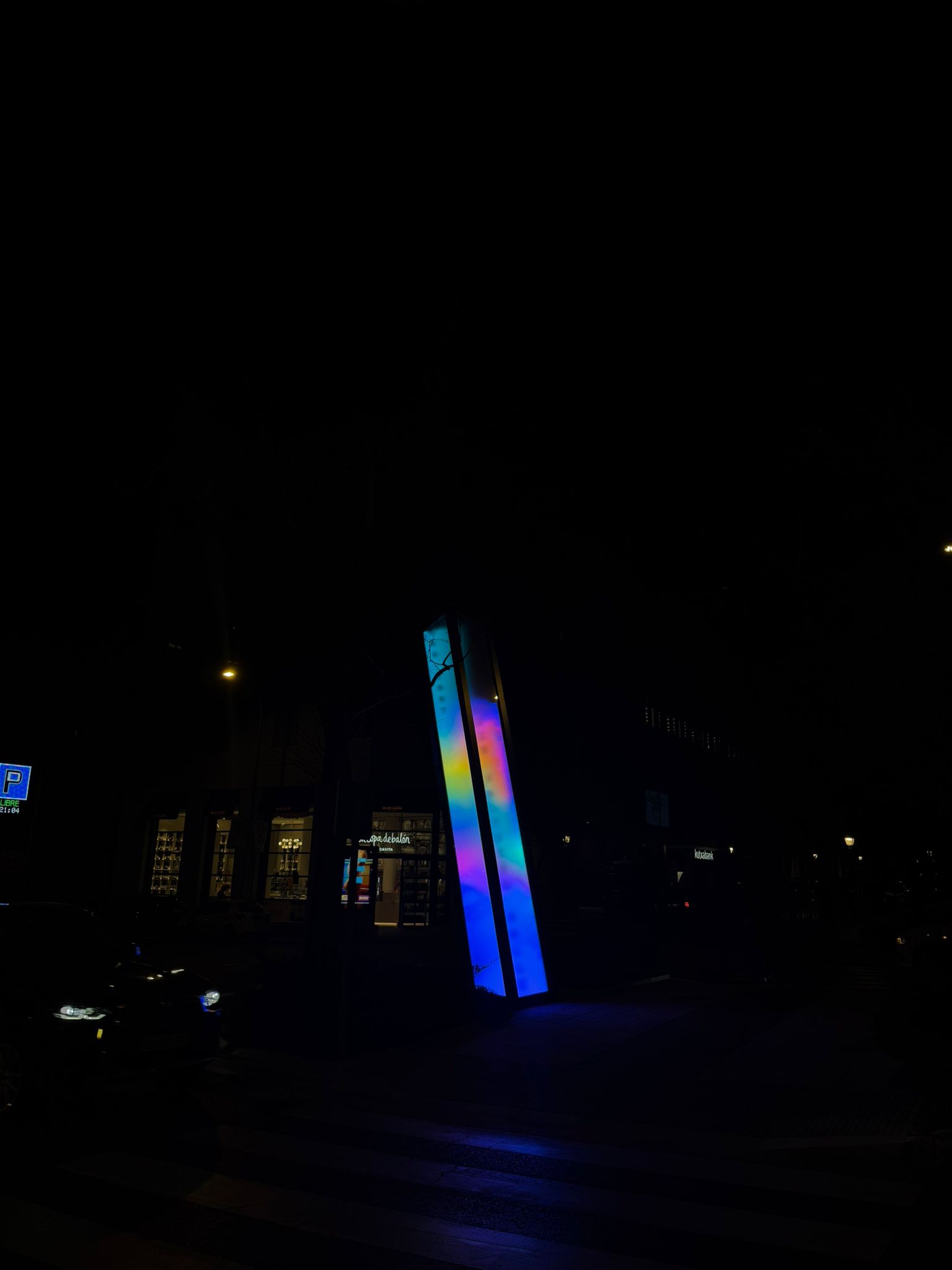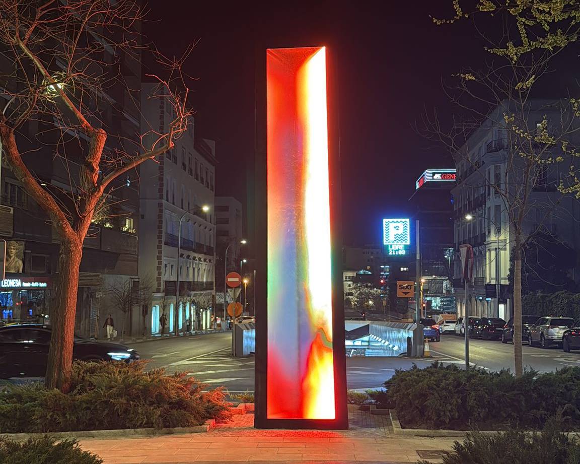 Standing six metres tall and one metre wide, Vértice is a slightly tilted luminous prism combining a metal structure, glass panels and an LED screen displaying generative chromatic animations. A custom algorithm projects the names of the honoured journalists interwoven with fragments of their writing, making it a living monument in constant transformation.