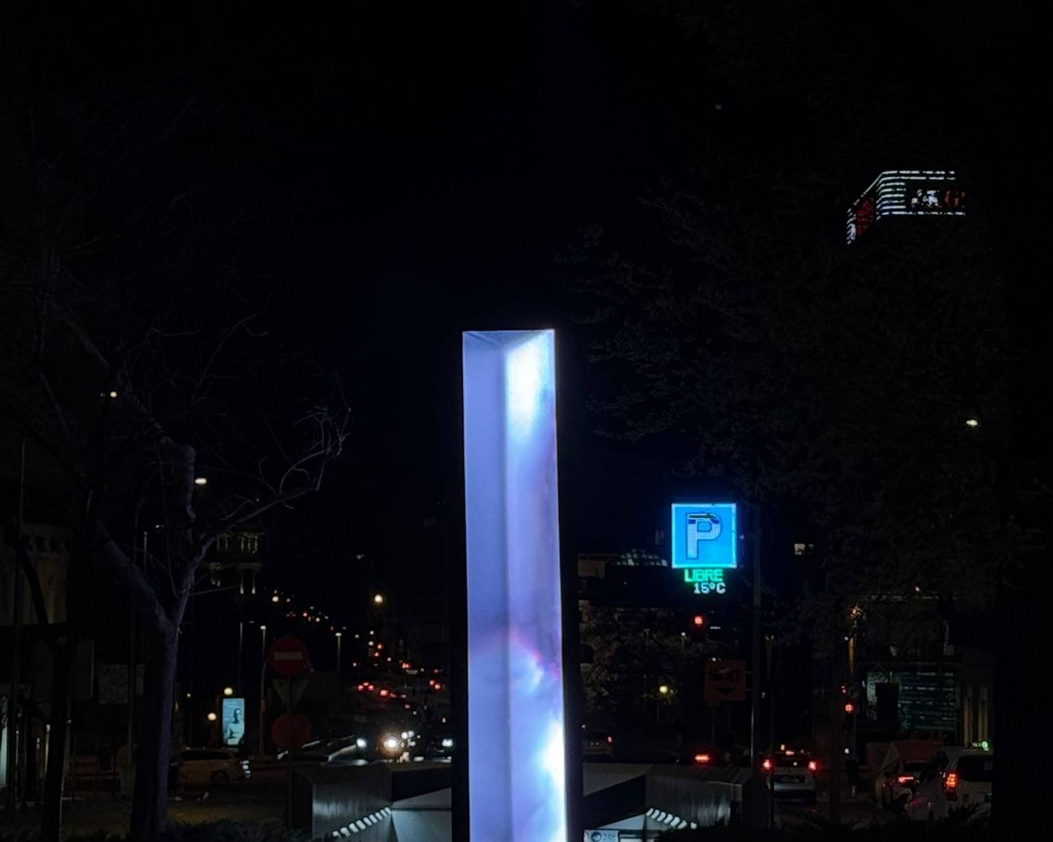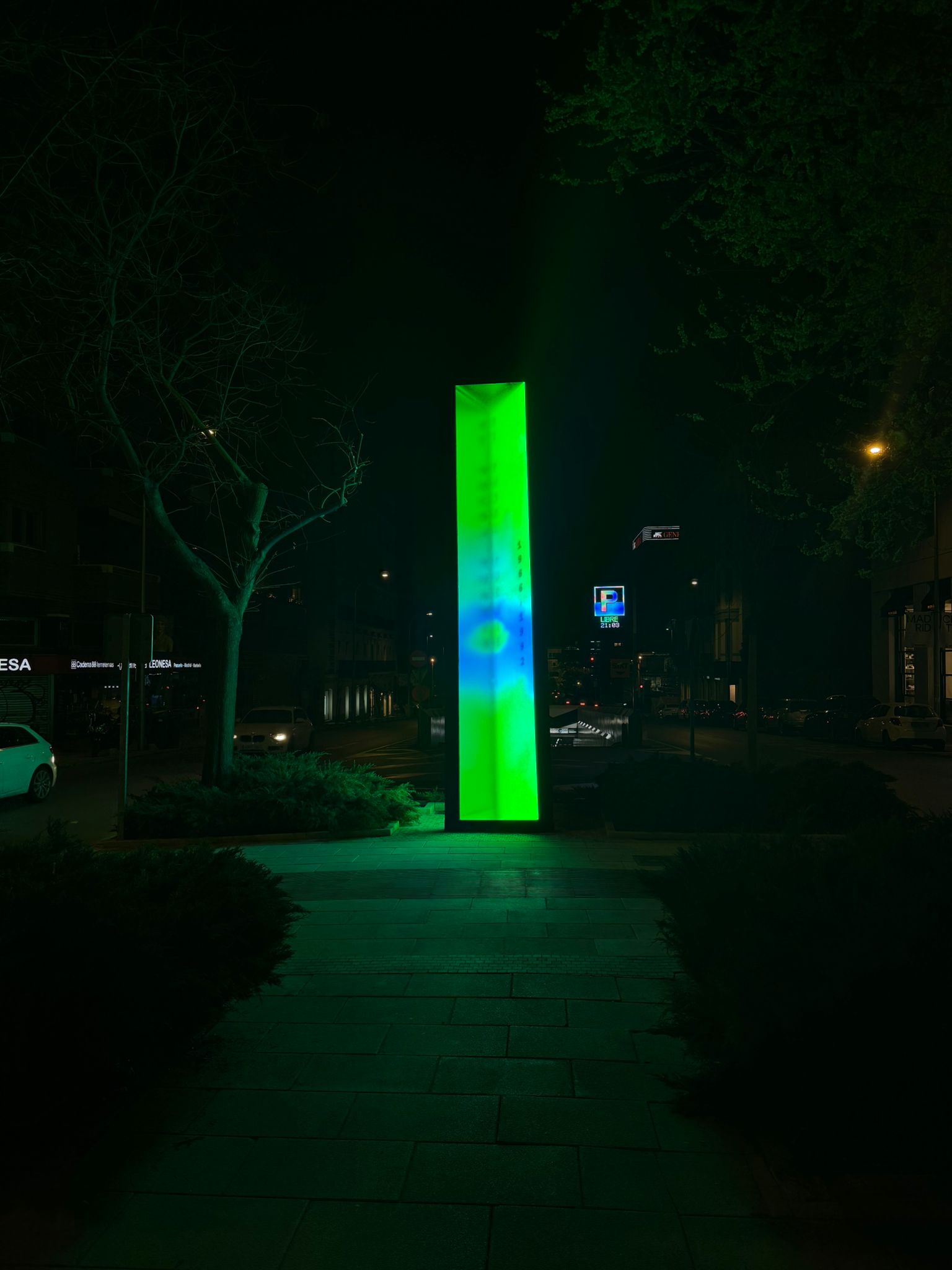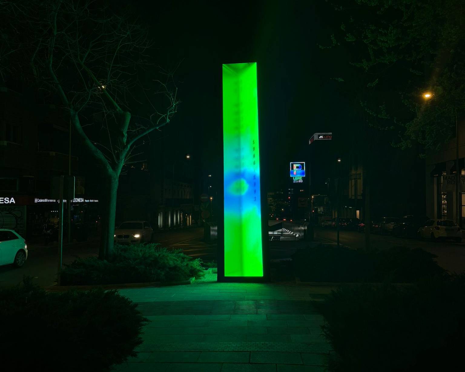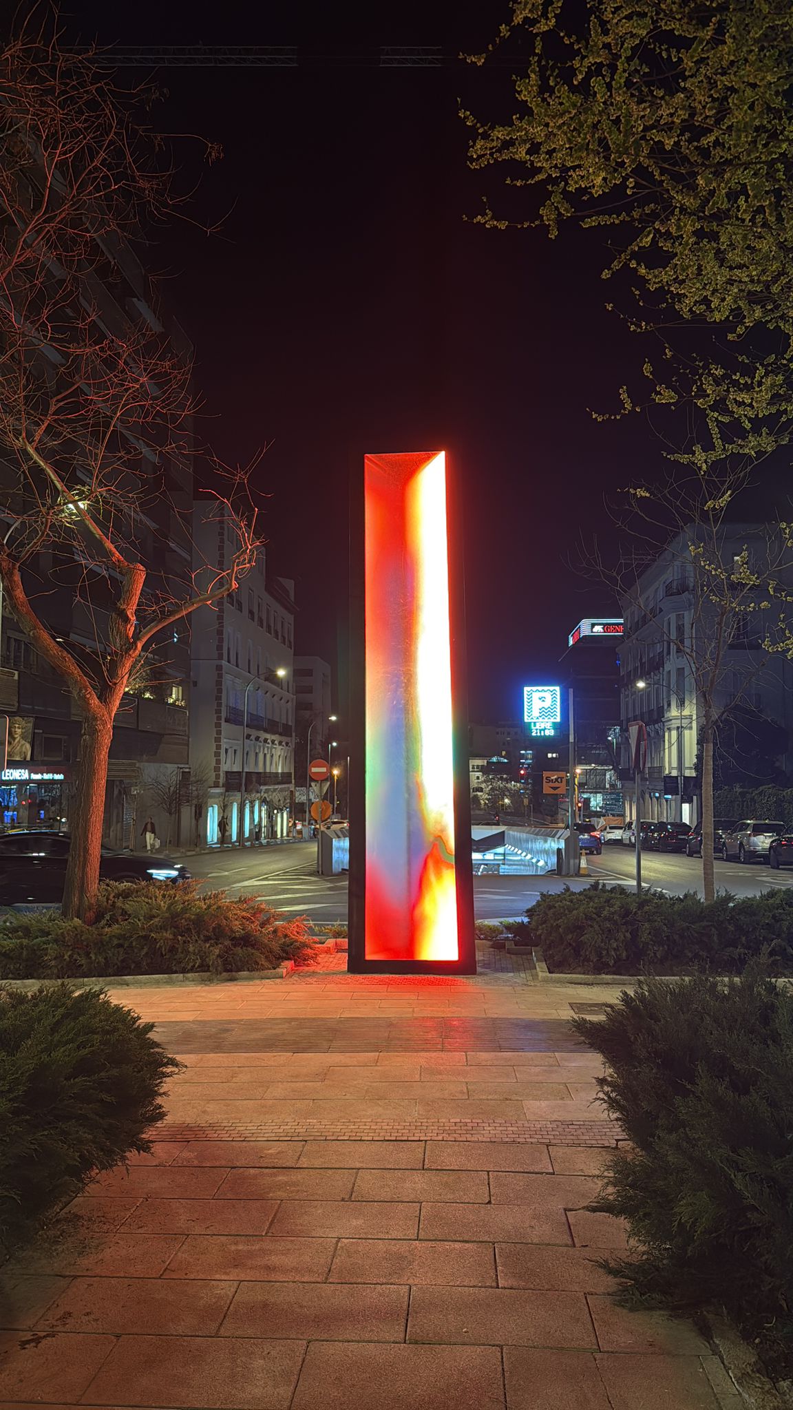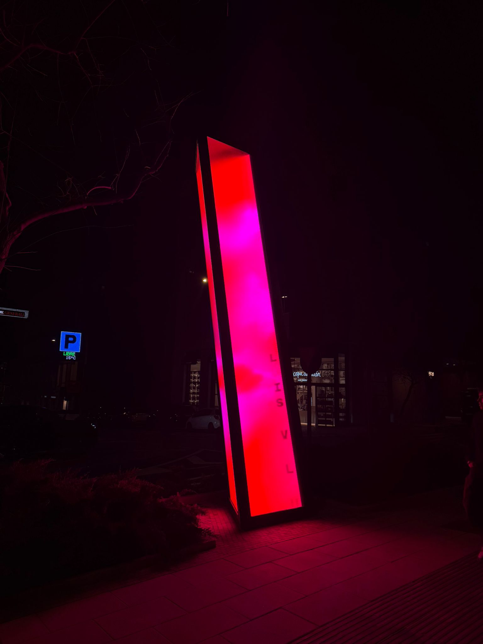 Standing six metres tall and one metre wide, Vértice is a slightly tilted luminous prism combining a metal structure, glass panels and an LED screen displaying generative chromatic animations. A custom algorithm projects the names of the honoured journalists interwoven with fragments of their writing, making it a living monument in constant transformation.
